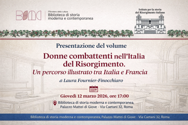 Giovedì 12 marzo 2026, alle ore 17.00, presso la Biblioteca di storia moderna e contemporanea (Palazzo Mattei di Giove, Via Caetani 32 – Roma), si terrà la presentazione del volume di Laura Fournier-Finocchiaro, Donne combattenti nell’Italia del Risorgimento. Un percorso illustrato tra Italia e Francia (Tab edizioni, 2025).